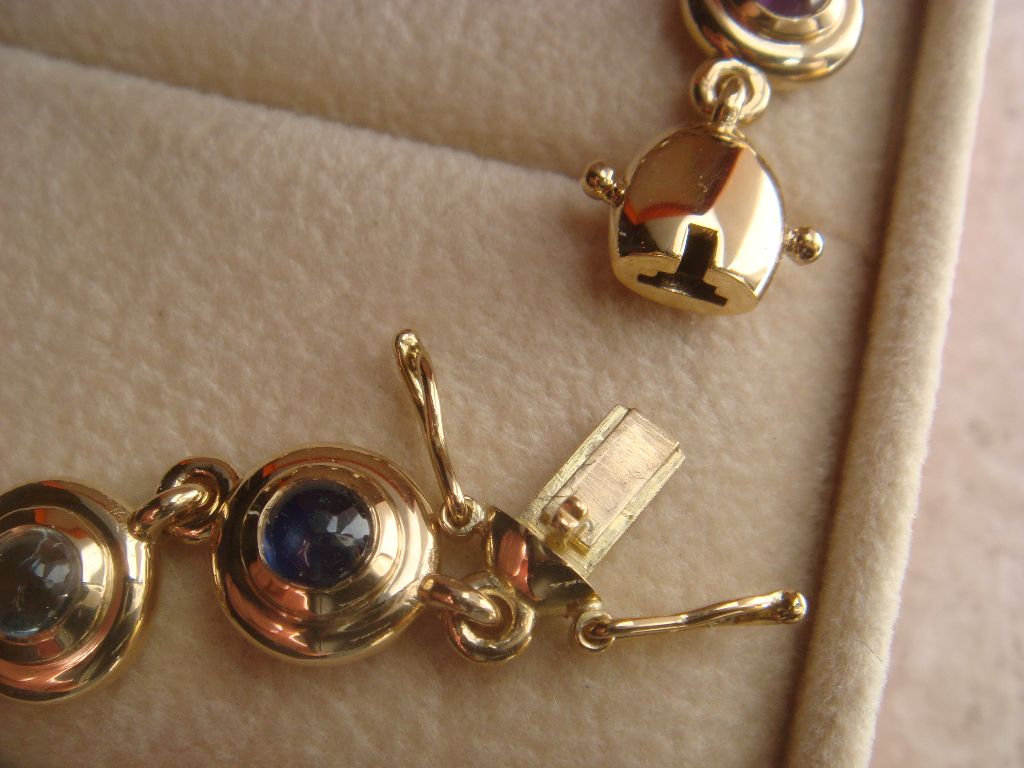 Armband mit verschieden farbigen Edelsteinen hier abgebildet in 750er Gelbgold. 2 große (Granat und Turmalin) und 12 kleine (Saphier, Topas, Amethyst, Granat) Cabochon Steine mit einem ovalen Kastenschlösschen. Auch andere Steinfarben und Kombinationen möglich.