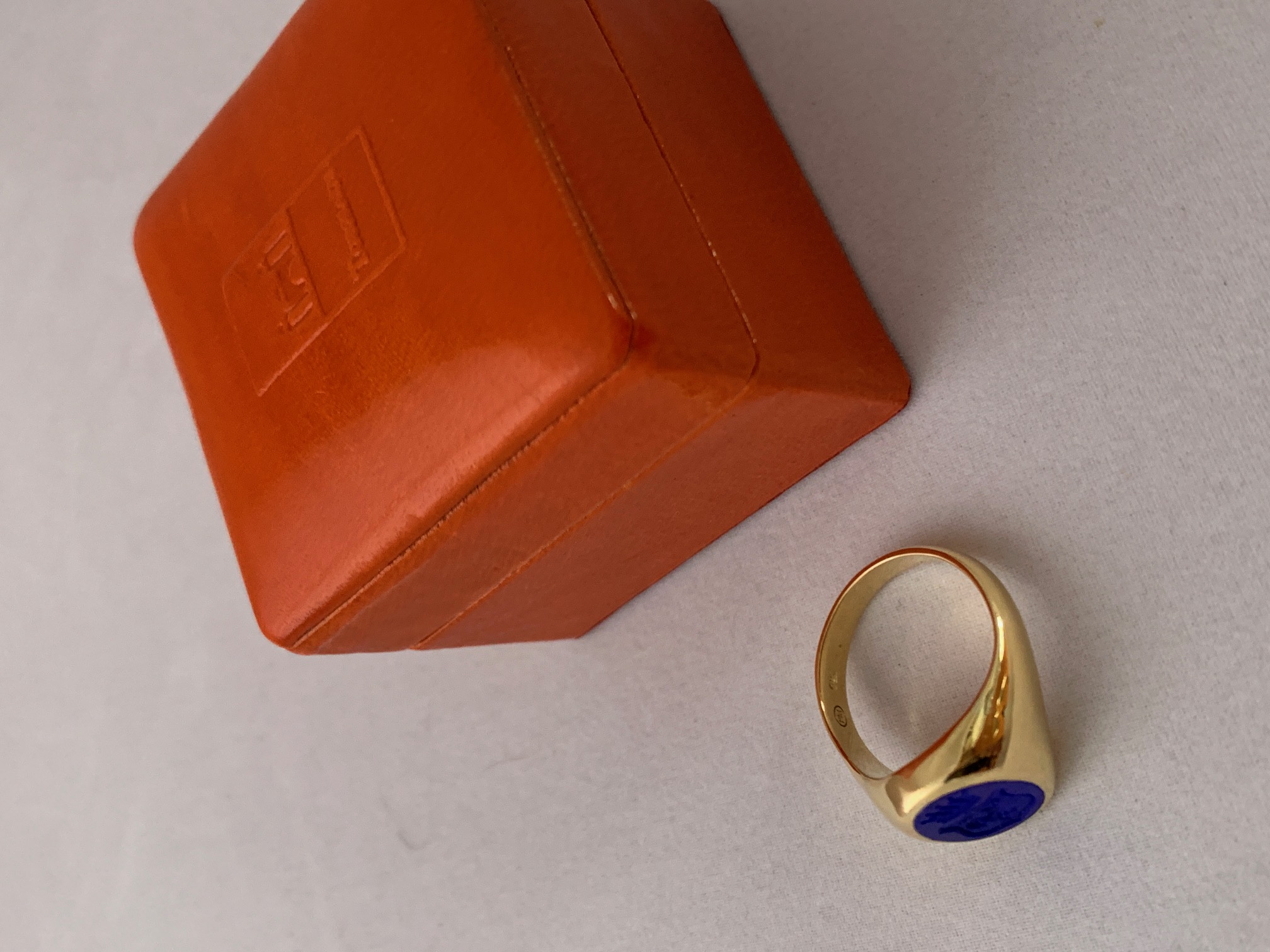 Siegelring in 750er Gelbgold mit ovalen Lapislazuli, Lagenonyx (blau/schwarz) oder Lagencarneol (rot) mit einer Wappen/Siegelgravur. Preise je nach Gravuraufwand und Stein. Auch andere Ringschienen möglich